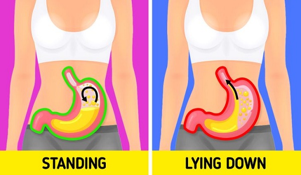 Thông thường, axit được tạo ra khi tiêu hóa thức ăn được chứa trong dạ dày. Lực hấp dẫn giúp ích rất nhiều ở đây, vì nó ép dòng chất lỏng đi xuống. Khi nằm xuống, axit sẽ di chuyển qua dạ dày và có thể tiếp xúc với các bộ phận nhạy cảm của hệ tiêu hóa. Điều này có thể dẫn đến chứng ợ nóng, cảm giác đau rát ở ngực hoặc cổ họng.