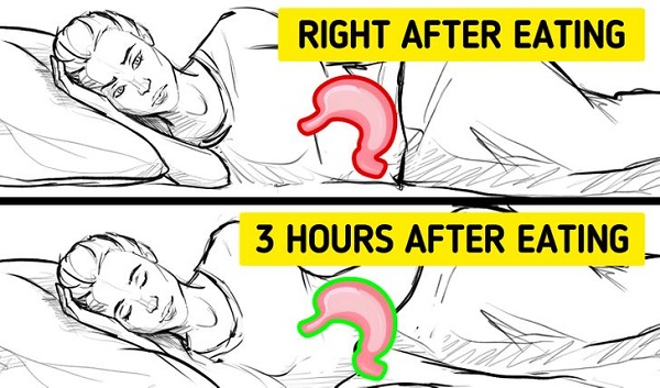 Các nhà dinh dưỡng nói rằng khi ăn no, ít nhất 3 tiếng sau bạn mới nên đi ngủ. Điều đó sẽ ngăn chặn bất kỳ vấn đề như ợ chua hoặc mất ngủ ban đêm xảy ra.