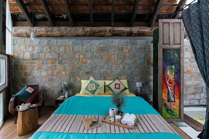 Cái đẹp đến từ sự đơn giản và thuần túy. Từ bức tường đá là mộc mạc, chân thực đến nét nhấn nhá trên miếng thổ cẩm và thảm trải sàn.