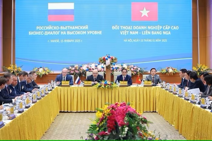 Thủ tướng Phạm Minh Chính và Thủ tướng Nga Mikhail Vladimirovich Mishustin đối thoại với doanh nghiệp cấp cao Việt Nam-Liên bang Nga (Hà Nội, 15/1/2025). (Ảnh: Dương/TTXVN)
