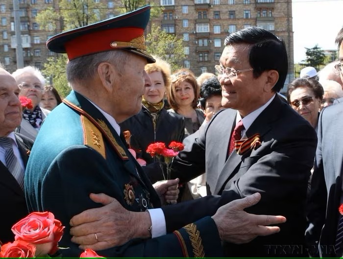 Nhân dịp sang dự lễ kỷ niệm 70 năm Chiến thắng trong Chiến tranh vệ quốc vĩ đại, sáng 8/5/2015, tại Thủ đô Moscow, Chủ tịch nước Trương Tấn Sang gặp gỡ cựu Chiến binh Nga trong lễ đặt hoa tại Tượng đài Chủ tịch Hồ Chí Minh. (Ảnh: Nguyễn Khang/TTXVN)