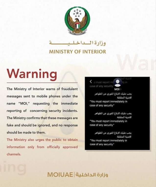 Bộ Nội vụ cảnh báo về các tin nhắn giả mạo được gửi tới điện thoại di động dưới danh nghĩa “MOI”, yêu cầu người nhận báo cáo ngay các sự cố an ninh đáng ngờ. Ảnh: Instagram/Bộ Nội vụ Các Tiểu vương quốc Arab Thống nhất.