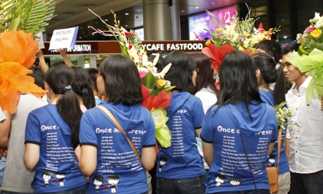 (Các bạn cùng lớp với Mai Hương có mặt tại sân bay Mặc chiếc áo đồng phục của lớp, các bạn của Mai Hương đã có mặt tại sân bay Nội Bài từ 21 giờ để đón Hương..)