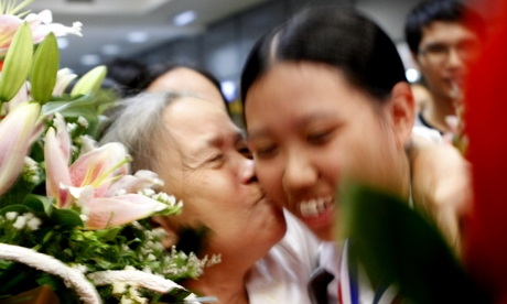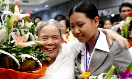 “Em cảm thấy rất vui và hãnh diện khi được nhiều người ra đón và quan tâm tới mình” - Mai Hương (trường THPT Chuyên Lê Hồng Phong) – thí sinh nữ duy nhất của đoàn xúc động.