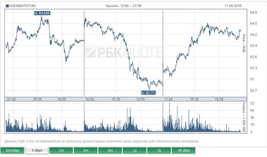 Biểu đồ tỷ giá USD trên sàn ngoại hối Moskva ngày 7, 10, 11/8/2015. Hôm nay 11/8, tỷ giá USD vào buổi chiều tăng hơn 1,5 rúp so với buổi sáng