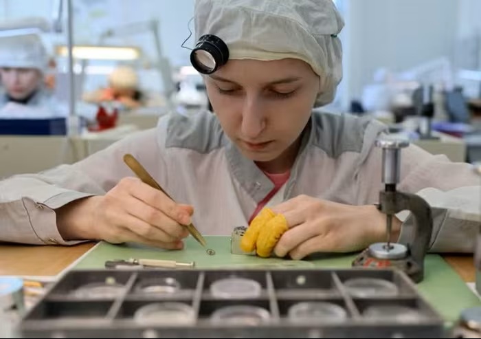 Các công nhân lắp ráp các bộ phận đồng hồ tại nhà máy đồng hồ Raketa ở Peterhof, thuộc thành phố Saint Petersburg, Nga. Ảnh: Reuters.
