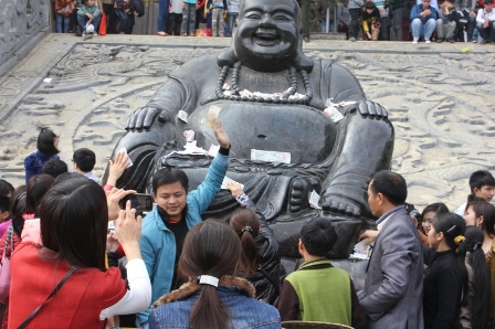 Chen nhau xoa tiền lên tượng Phật Di Lặc cầu may