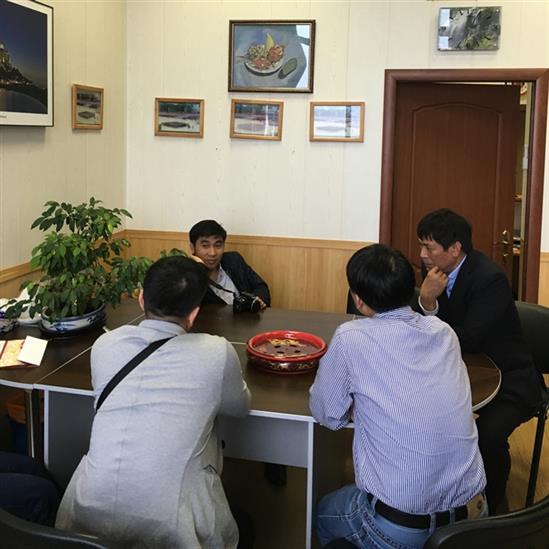 Phóng viên NNVN đang trao đổi với ông Đỗ Thế Cước (áo trắng) về cuộc sống người Việt tại Nga