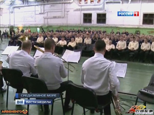 Một buổi hòa nhạc được tổ chức bên trong nhà chứa máy bay giúp thủy thủ đoàn thư giãn sau những ngày làm việc căng thẳng.