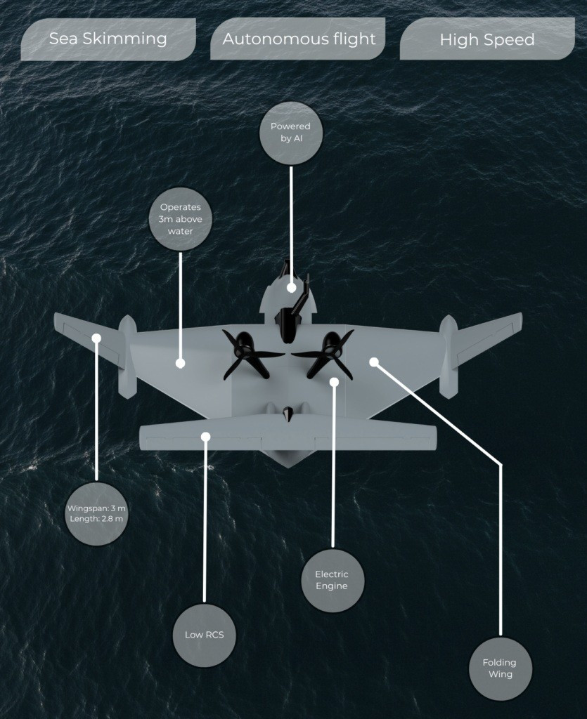 Công ty tuyên bố rằng drone có khả năng tấn công cảng biển và tấn công các tàu đối phương từ trên cao. Được trang bị cánh gập, hệ thống này được hỗ trợ bởi AI để đạt độ chính xác cao.