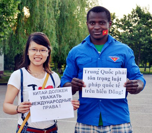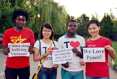 Một số du học sinh nước ngoài yêu hòa bình cũng mang theo khẩu hiệu tham gia cùng sinh viên Việt Nam phản đối hành động của Trung Quốc.