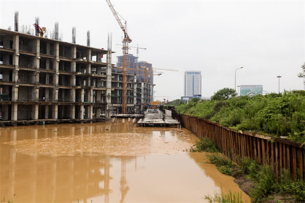 Ngay sát hố sụt lún là rất nhiều tòa nhà đang xây dựng dỡ dang - Ảnh: Nguyễn Khánh
