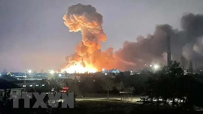 Khói lửa bốc lên từ một vụ nổ ở thủ đô Kiev, Ukraine ngày 24/2/2022. (Ảnh: Ukrainian President’s Office/TTXVN).