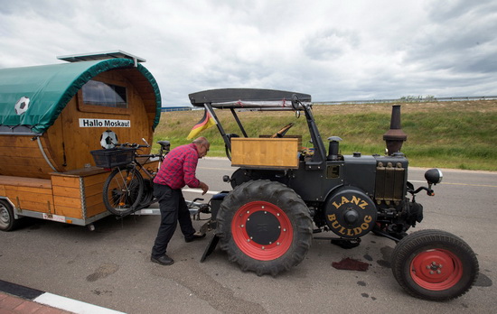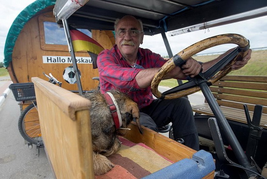 Ông Hubert Wirth, 70 tuổi, khởi hành cho chuyến hành trình tới Nga từ thành phố Pforzheim của Đức. Ông dự kiến sẽ đến Moscow trong 10 ngày. Người bạn đồng hành của ông là một chú chó cưng.