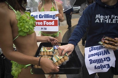 Những thiếu nữ mặc bikini xanh xuống phố kêu gọi ăn chay là thành viên của hội PETA (People for the Ethical Treatment of Animals - tạm dịch là Hiệp hội con người vì hành vi nhân đạo đối với động vật).