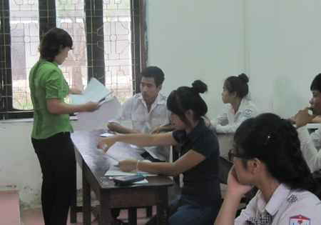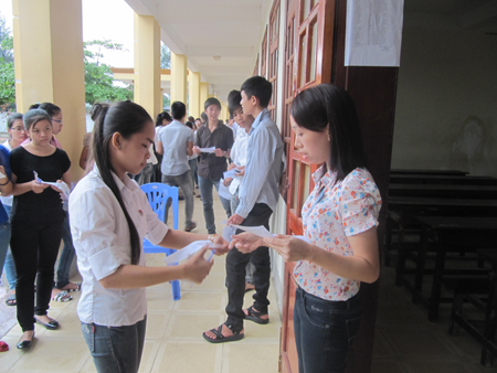 Giám thị tại Nghệ An phát giấy thi cho thí sinh. (Ảnh: Hoàng Lam)