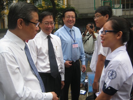 Phó Chủ tịch UBND TPHCM Hứa Ngọc Thuận, Giám đốc Sở GD-ĐT Lê Hồng Sơn động viên tinh thần thí sinh trước khi vào phòng thi. (Ảnh: Hoài Nam)