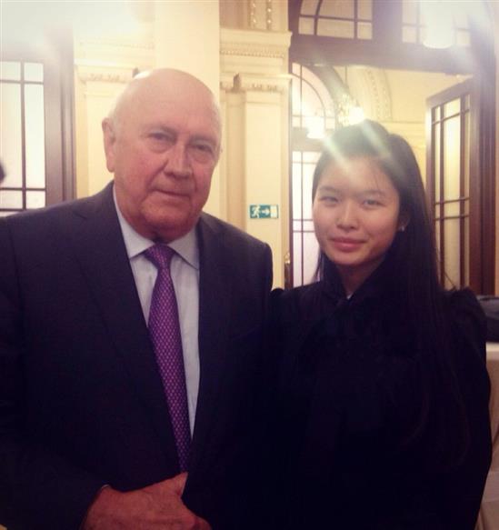 Lan Anh và cựu tổng thống Nam Phi Frederik Willem de Klerk - người từng nhận giải Nobel Hòa Bình cùng Nelson Mandela năm 1993. Ảnh: NVCC