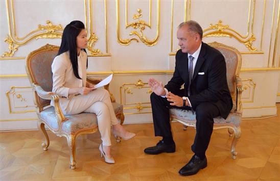 Lan Anh phỏng vấn Tổng thống Slovakia Andrej Kiska. Ảnh: NVCC