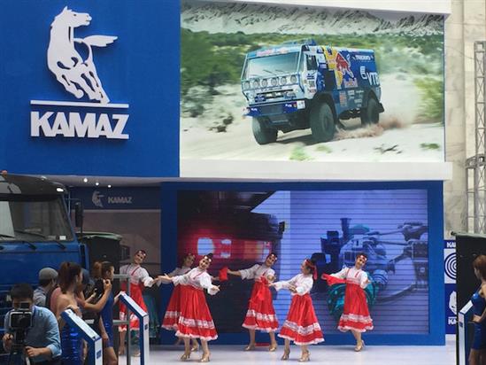 Gian hàng của Kamaz nằm ở khuôn viên ngoài trời với các sản phẩm xe tải nặng.
