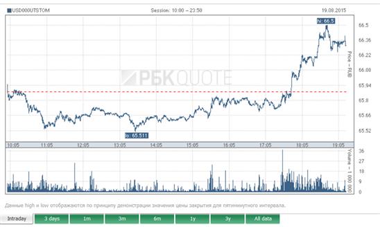 Biểu đồ tỷ giá USD trên sàn ngoại hối Moskva ngày 19/8/2015
