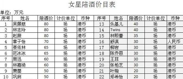 Một bảng giá đi khách khác gồm 22 gương mặt sao nữ nổi đình nổi đám trong showbiz Hoa ngữ: 1. Ngô Bội Từ, 2. Lâm Chí Linh, 3. Triệu Vy, 4. Chương Tử Di, 5. Thái Y Lâm, 6. Phạm Băng Băng, 7. Châu Tấn, 8. Lâm Gia Kỳ, 9. Tiêu Tường, 10. Củng Lợi, 11. Lạc Cơ Nhi, 12. Twins, 13. Lâm Di Phúc, 16.Thư  Kỳ, 17. Liễu Nham, 18. Trần Kiều Ân, 19. Vương Phi, 20. Trương Bá Chi, 21. Diệp Tuyền, 22. Trịnh Hy Di.