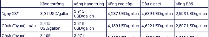 Theo AAA Gas Prices, giá xăng thường trung bình toàn quốc đã tăng lên 3,51 USD/gallon vào ngày 27/1. Như vậy, giá của mỗi gallon xăng (tương đương 3,78 lít) chênh 0,12 USD so với tuần trước đó và 0,41 USD so với một tháng trước đó.