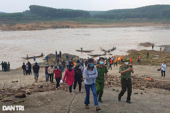 Trong những người này có Phó Giám đốc Sở GTVT; 7 người gặp nạn ngồi trên một trụ bê tông giữa dòng nước chảy xiết. Gần đó, một chiếc tàu hút cát đang mắc kẹt giữa thân đập tràn.