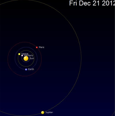Mô phỏng vị trí thực của 5 hành tinh chính vào ngày 21/12, thực tế không có chuyện các hành tinh thẳng hàng. Ảnh: abovetopsecret.com.