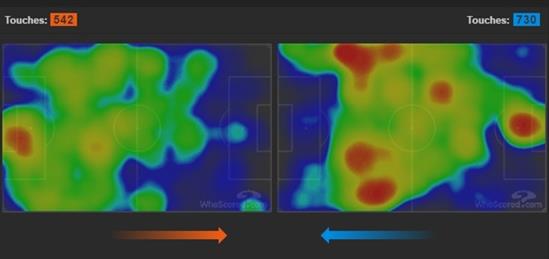 Tuyến giữa bị chặn đứng, hàng công Tây Ban Nha với Alvaro Morata và Nolito trở thành người thừa.  Qua biểu đồ nhiệt của WhoScored, dễ dàng nhận thấy Tây Ban Nha chỉ biết loay hoay với bóng tập trung ngoài khu vực cấm địa của Italy. Lý do vì nhà vô địch Euro 2012 vấp phải một bức tường phòng ngự kiên cố, có tổ chức và kỷ luật.