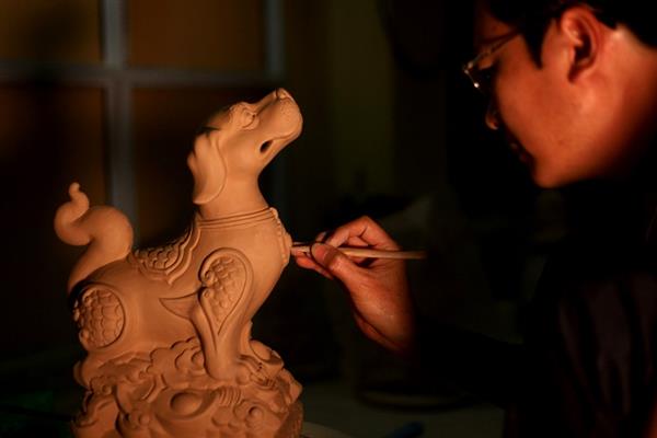 Quy trình điêu khắc hoàn toàn thủ công được nghệ nhân làng gốm Bát Tràng chế tác linh khuyển.
