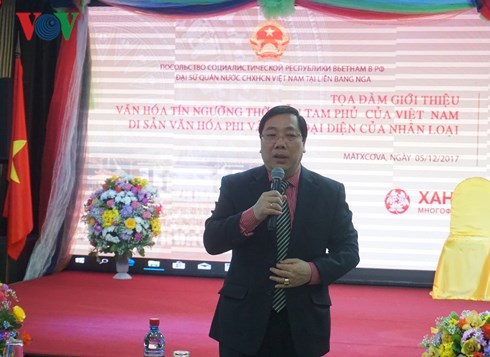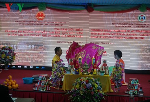 Nhân kỷ niệm 1 năm (1/12/2016 - 1/12/2017) ngày Văn hóa tín ngưỡng Thờ Mẫu Tam Phủ của người Việt được UNESCO công nhận là di sản Văn hóa phi vật thể đại diện của nhân loại, được sự đồng ý của Đại sứ quán Việt Nam tại Liên bang Nga, sự hỗ trợ của Tổ hợp đa chức năng “Hà Nội - Matxcơva” (Incentra), hôm qua (5/12), Trung tâm nghiên cứu và bảo tồn Văn hóa tín ngưỡng Việt Nam đã tổ chức buổi tọa đàm giới thiệu về di sản Văn hóa này tới bạn bè Nga và Cộng đồng người Việt Nam đang sinh sống, học tập và kinh doanh tại LB Nga.
