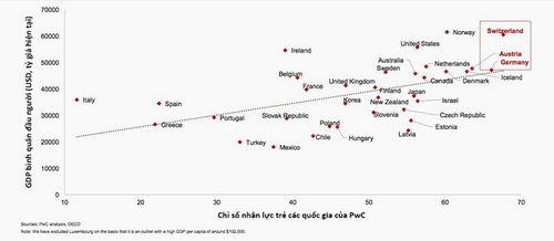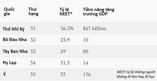 Trong danh sách những nước có nguồn nhân lực trẻ hàng đầu của PwC với các so sánh dựa trên tiêu chí khác nhau, Thụy Sỹ đứng hạng nhất và Đức xếp thứ hai. Mỹ đứng 10 và Anh xếp hạng 21. Các nước Nam Âu khác thậm chí còn bị tụt lại phía cuối - điều cho thấy khủng hoảng nợ Châu Âu đã đè nặng lên những lao động trẻ tuổi. Ý đứng cuối bảng xếp hạng với tỷ lệ thất nghiệp hoặc không đến trường chạm ngưỡng 35% dân số trẻ. Theo một báo cáo gần đây, nếu Ý có thể giảm con số này về 10% như Đức thì GDP đất nước có thể tăng thêm 156 tỷ USD. Một báo cáo khác đưa ra tuần trước cũng cho thấy cứ 10 ngươi Ý dưới tuổi 34 thì lại có 1 người sống trong nghèo túng.