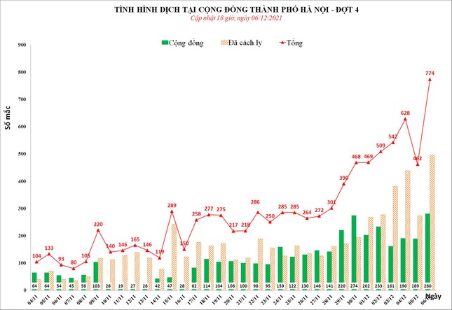 Ngày 6/12, Hà Nội ghi nhận 774 ca dương tính SARS-CoV-2, trong đó có 280 trường hợp ở cộng đồng, 343 trường hợp ở khu cách ly và 151 trường hợp trong khu phong tỏa.