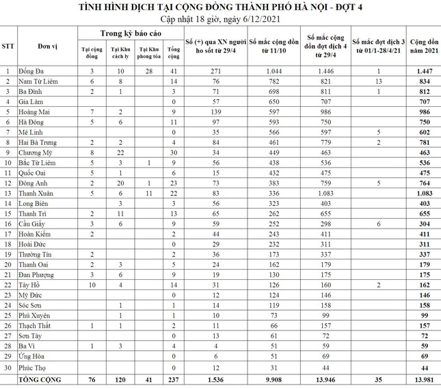 Cộng dồn trong đợt dịch 4 (từ ngày 29/4/2021), Hà Nội ghi nhận 13.946 ca mắc COVID-19, trong đó số mắc ghi nhận ngoài cộng đồng 5.492 ca, số mắc là đối tượng đã được cách ly 8.454 ca.