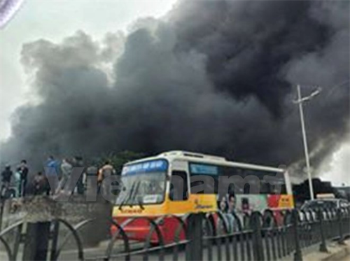 Khói đen bốc lên tại chợ Nhật Tân đang bao phủ khắp khu vực. (Ảnh: CTV/Vietnam+)
