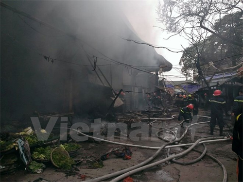 Toàn cảnh vụ cháy xung quanh khu vực chợ Nhật Tân. (PV/Vietnam+)