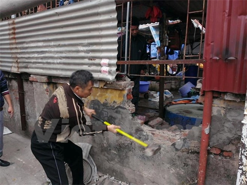 Người dân tiến hành đập tường để xử lý vụ cháy. (Ảnh: PV/Vietnam+)