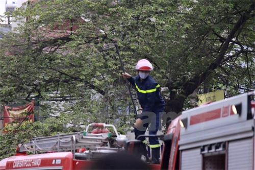 Lực lượng cứu hỏa đến tham gia dập lửa. (PV/Vietnam+)