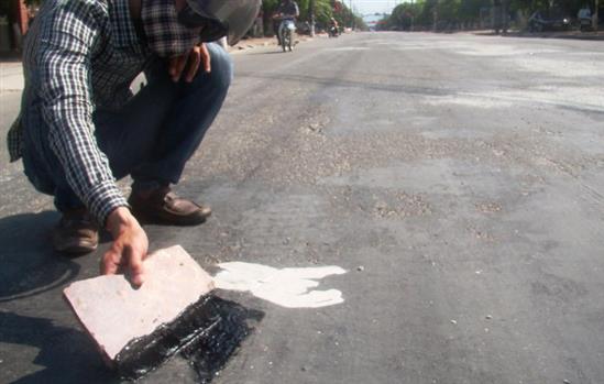 Bột đá xay được rải lên những đoạn đường bị chảy nhựa tránh gây nguy hiểm cho xe cộ qua lại - Ảnh: Văn Định
