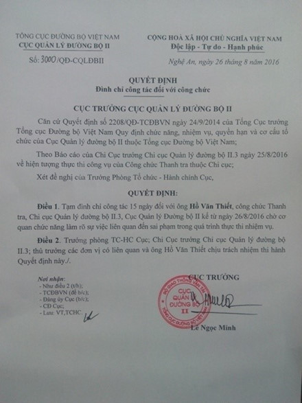 Liên quan đến vấn đề này, ngày 26.8, Cục Quản lý Đường bộ 2 đã ra quyết định đình chỉ công tác 15 ngày đối với 2 thanh tra giao thông Hồ Văn Thiết và Võ Văn Tự để làm rõ sai phạm khi thực thi nhiệm vụ.
