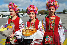 Các cô gái Ukraine trong trang phục truyền thống tiếp đón khách theo phong tục.