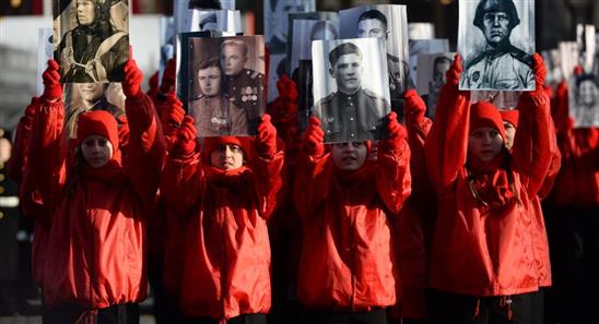 Sau đó, các em thiếu nhi chạy ra Hồng trường trong bộ trang phục màu đỏ và cầm trên tay ảnh của những người lính không bao giờ trở về từ chiến tranh. Từ trên cao có thể nhìn thấy chữ "Chiến thắng", được xếp hình bởi hai ngàn nhà hoạt động của phong trào thanh niên, theo TASS.