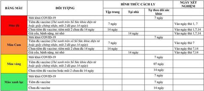 Đối với công dân từ các địa phương về Hải Phòng, áp dụng theo bảng hướng dẫn dưới đây (Áp dụng biện pháp tương ứng màu sắc ô cột theo thôn xóm; xã phường; quận huyện; tỉnh thành phố. Cách ly y tế dựa vào việc tiếp xúc, đi đến địa điểm và nơi cư trú có ca bệnh, theo Thông báo của Bộ Y tế, các tỉnh thành phố):