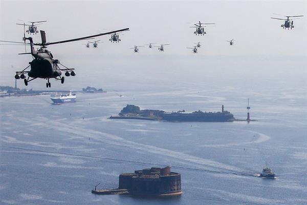 4.000 thủy thủ tham gia diễu binh trước mặt quan khách, tiếp đến là máy bay hải quân, bao gồm chiến đấu cơ Su-33 và MiG-29K cùng trực thăng Ka-52K và Ka-27M.