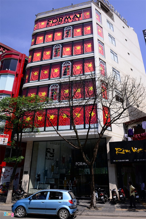 Một tòa nhà 8 tầng ở số 100 Trần Duy Hưng treo 48 lá cờ dọc 6 tầng xuyên suốt từ tầng 2 lên tầng 7, mỗi tầng treo 8 lá cờ.