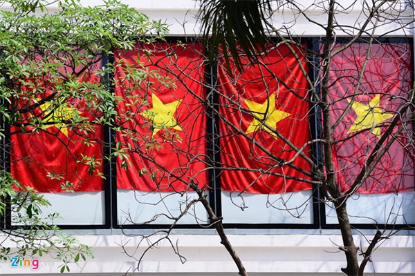 Mỗi lá cờ có kích cỡ 150 x 220 cm được đặt may riêng theo khổ của khung cửa kính.