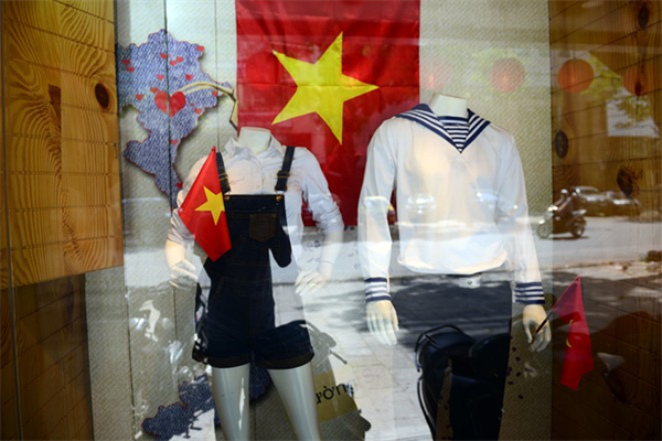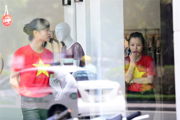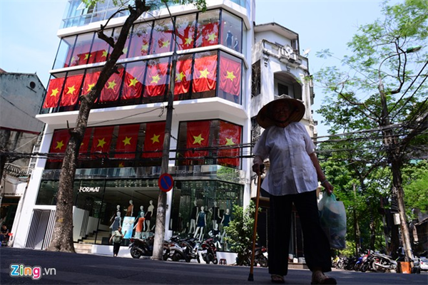 Một vài cửa hàng khác ở gần đó, các nhân viên bán hàng thời trang cũng mặc áo phông in hình cờ đỏ sao vàng đứng làm việc.