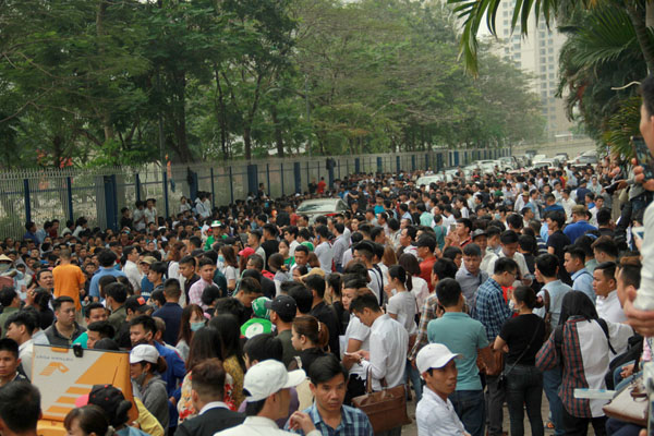 Hàng ngàn người dân có mặt từ sớm trước Phòng Lãnh sự Hàn Quốc để đợi làm thủ tục xin cấp visa. Ảnh Trần Cường