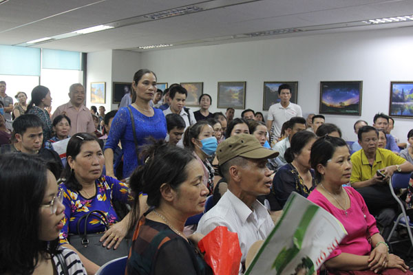 Khoảng 9 giờ sáng 10.4, khi Phòng Lãnh sự Hàn Quốc bắt đầu tiếp dân, mọi người đổ lên phòng chờ, phòng làm việc tuy nhiên phía vỉa hè vẫn còn hàng trăm người vạ vật ngồi chờ. Ảnh Trần Cường.